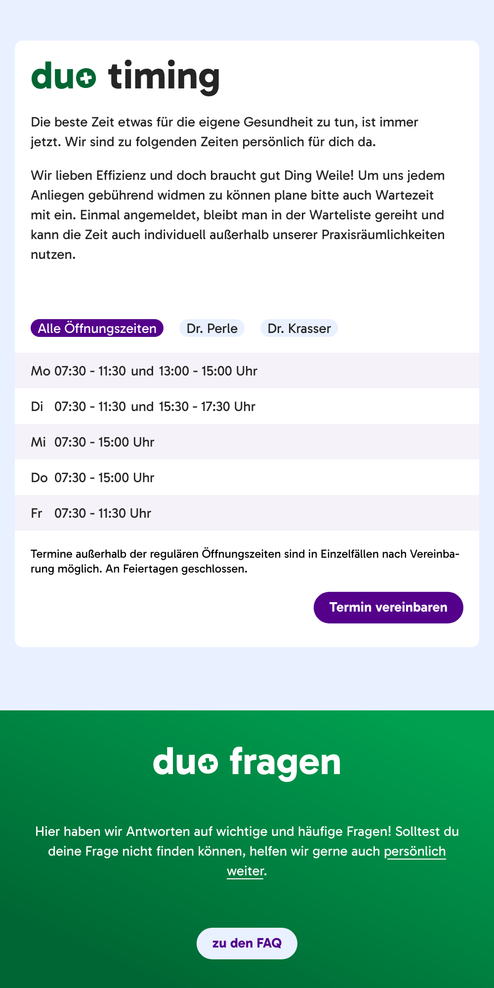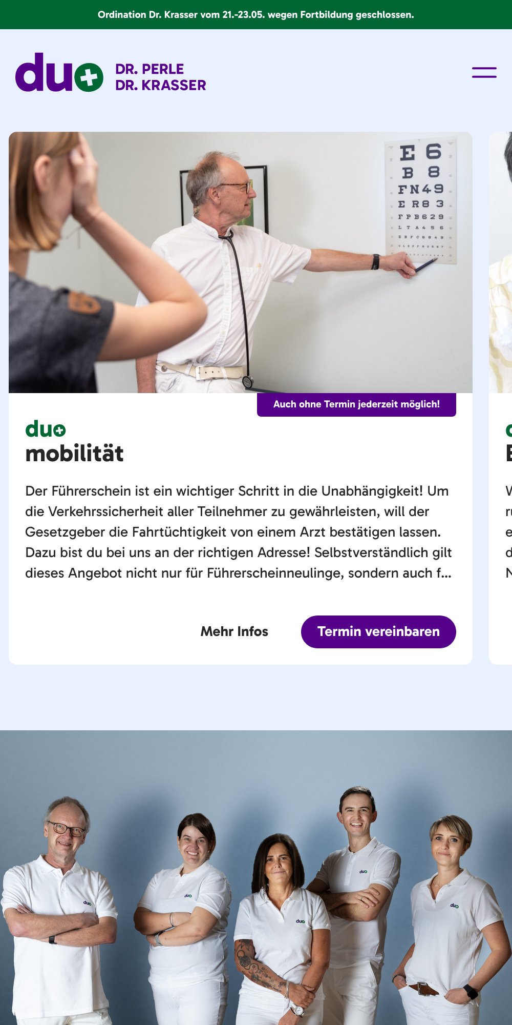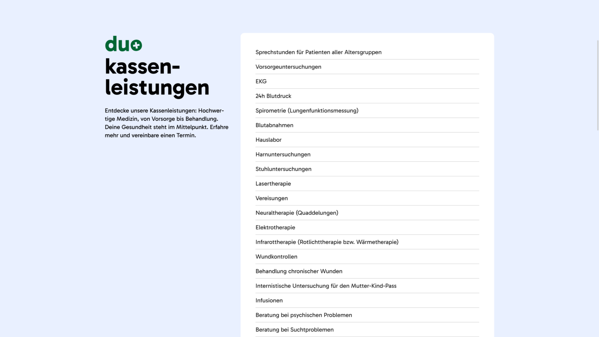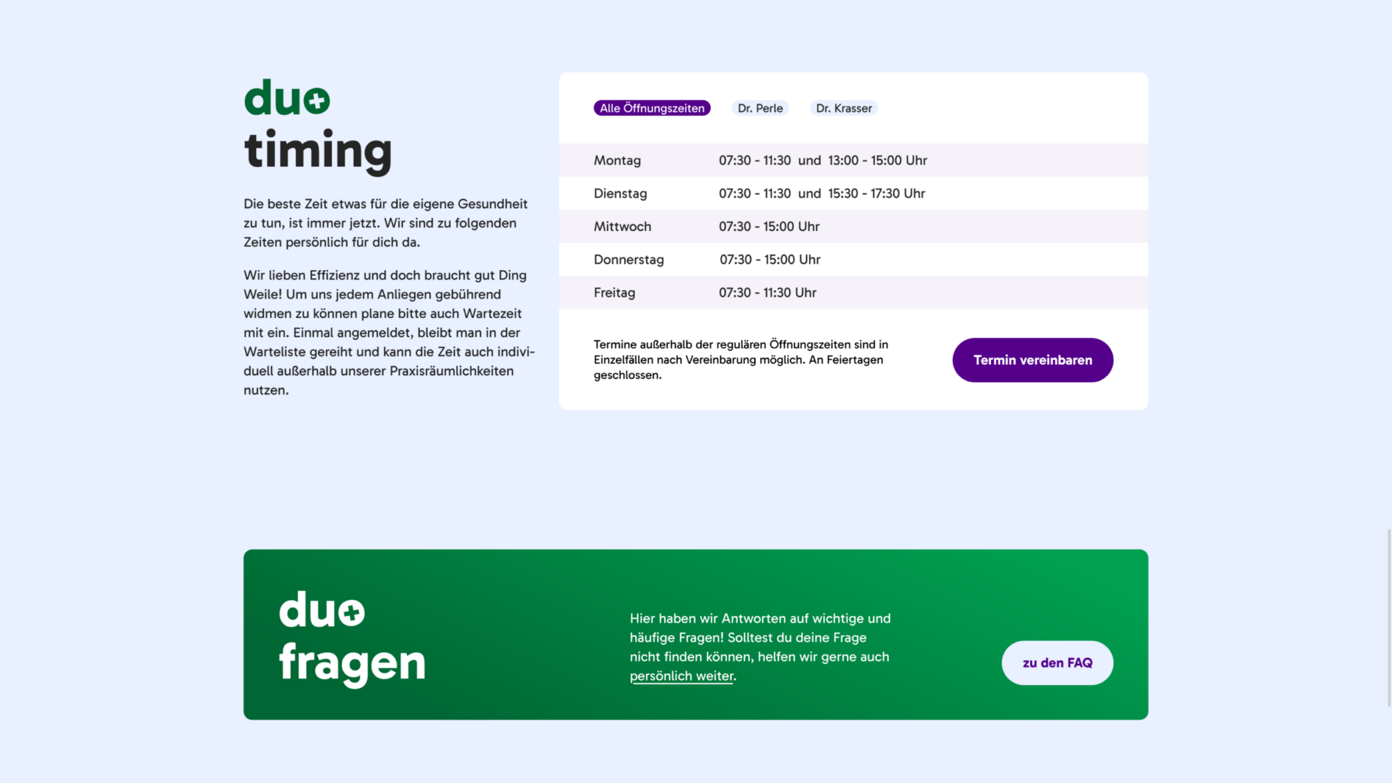 Für die duo Gemeinschaftspraxis war es wichtig, mit dem neuen Branding auch einen gemeinsamen, zeitgemäßen Online-Auftritt zu haben der den Patienten mehr bietet, als allein Öffnungszeiten und Kontakt. Die Website informiert über aktuell wichtige Infos, wie z.B. Impfungen und Vorsorgeuntersuchungen und zeigt ganz transparent die Preise für Privatleistungen. Für Patienten mit Dauermedikation besteht die Möglichkeit, die Rezepte online anzufordern – so sparen sie sich den Gang zur Arzpraxis.
