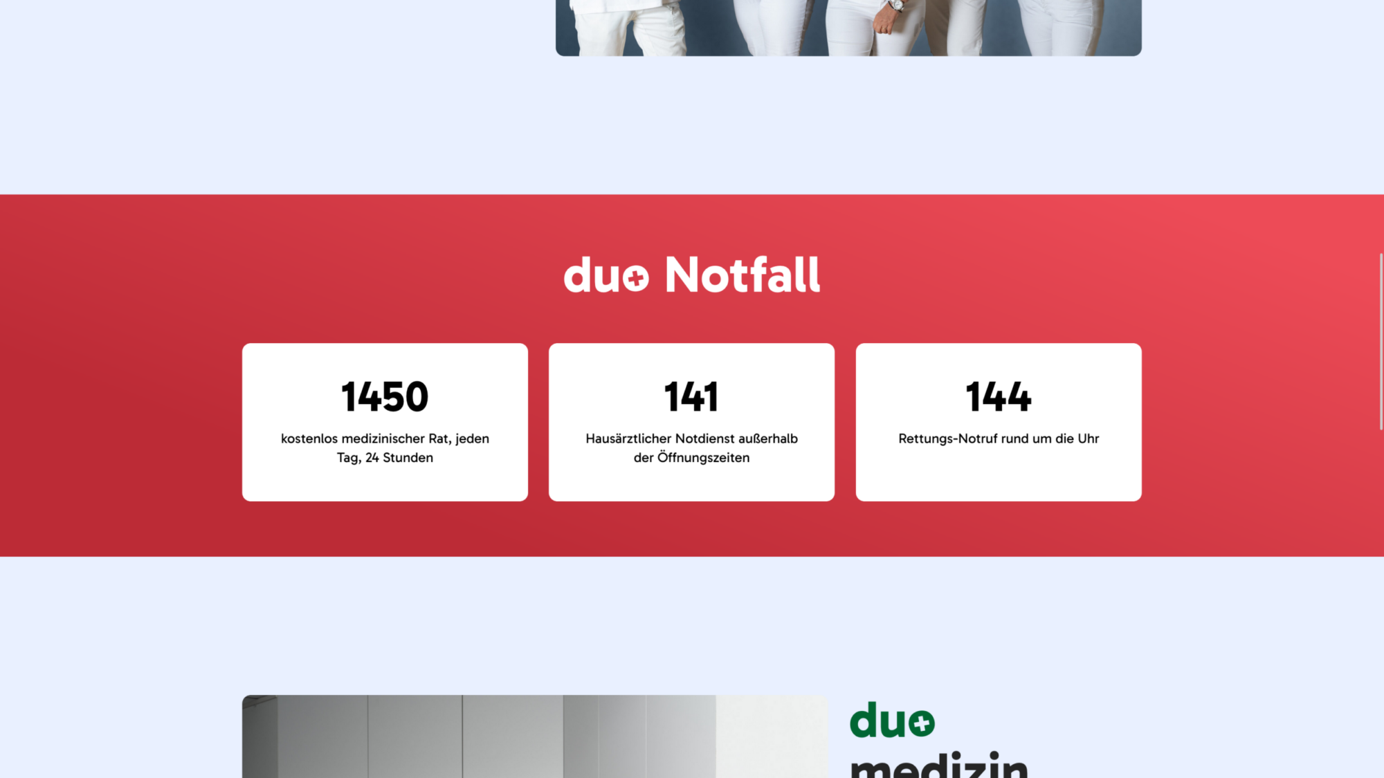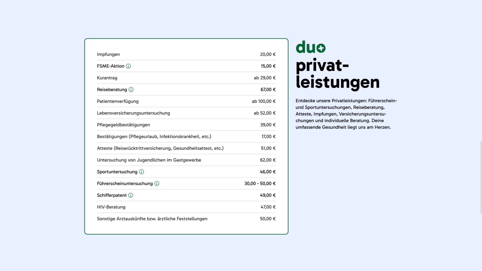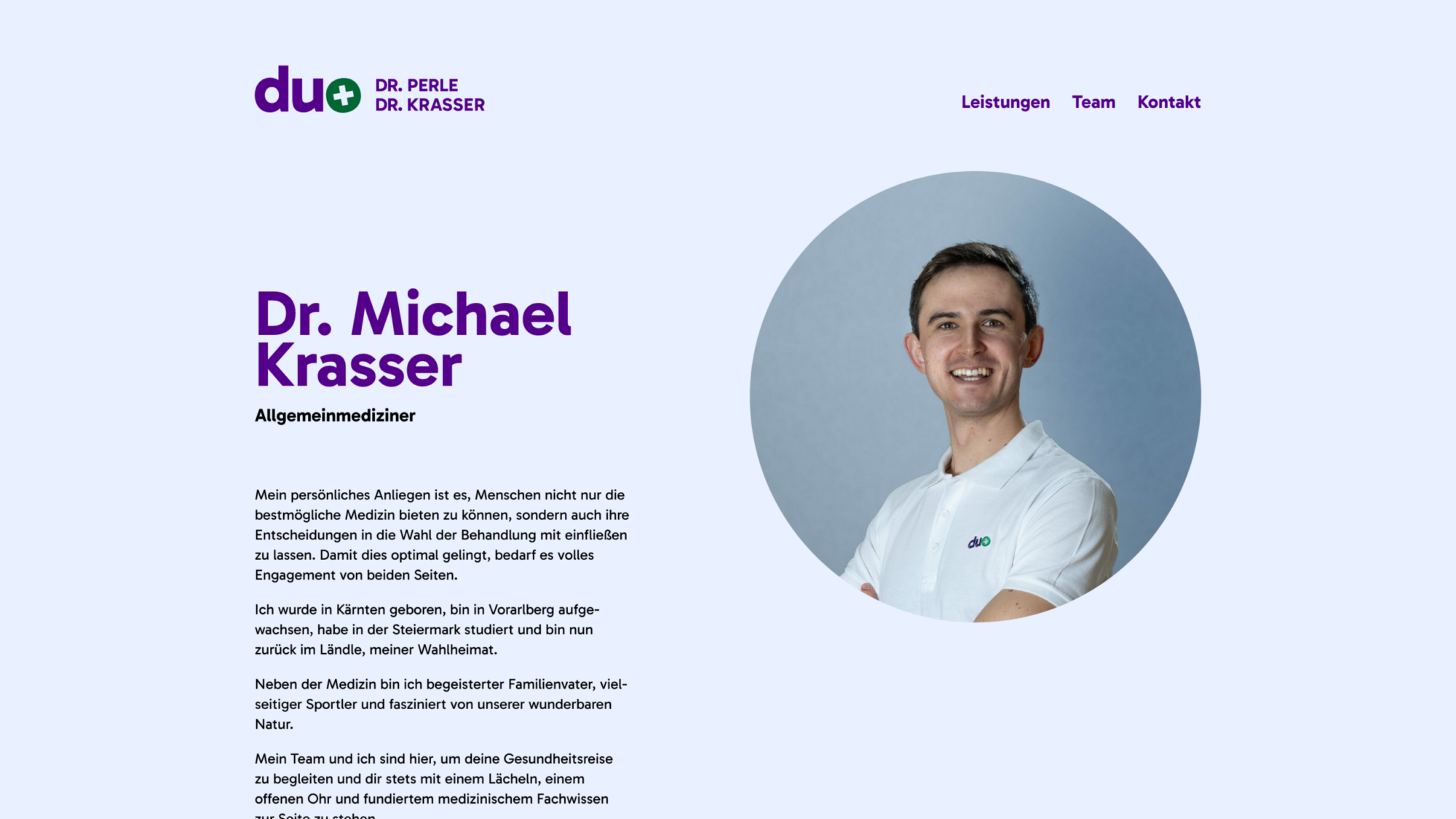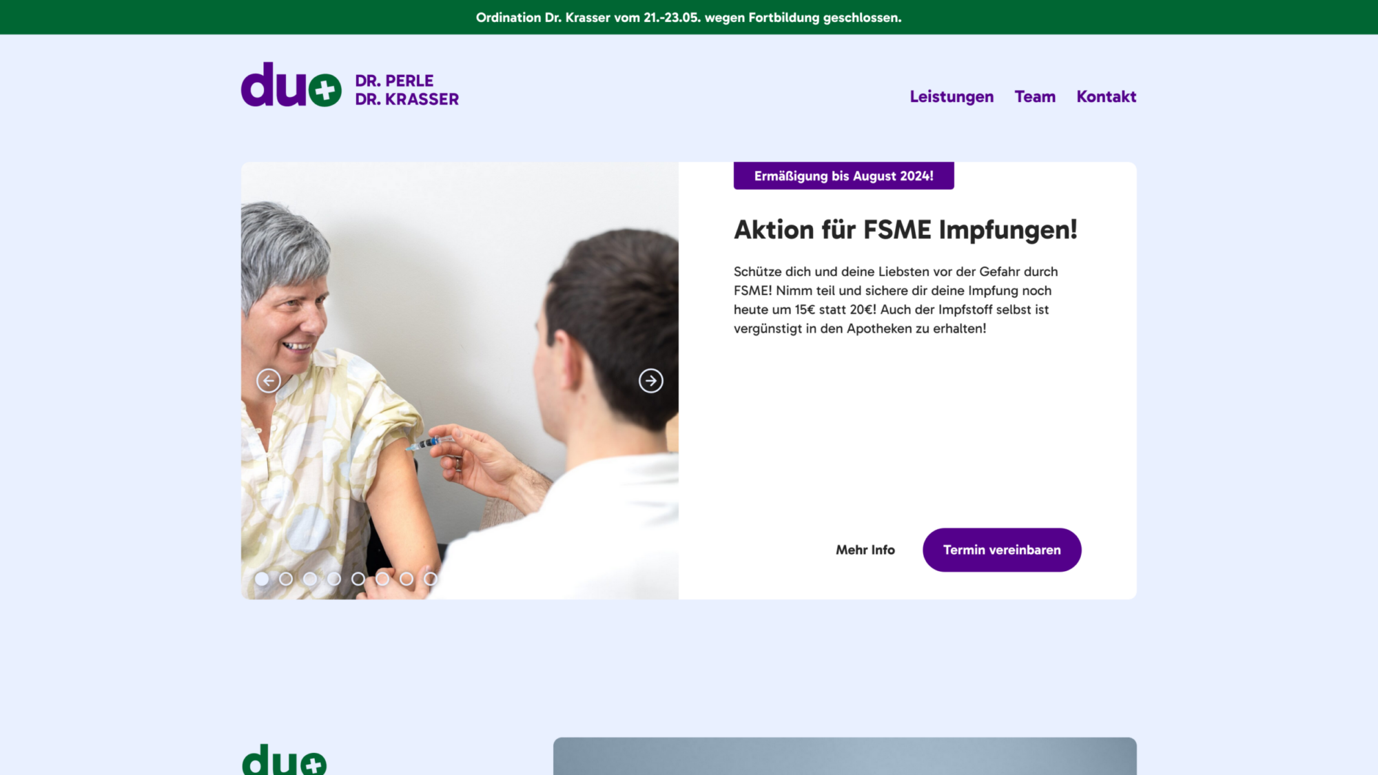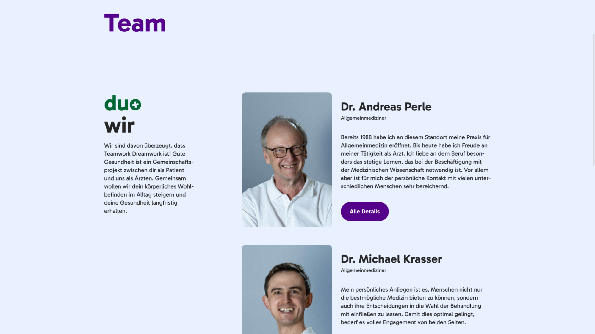 Für die duo Gemeinschaftspraxis war es wichtig, mit dem neuen Branding auch einen gemeinsamen, zeitgemäßen Online-Auftritt zu haben der den Patienten mehr bietet, als allein Öffnungszeiten und Kontakt. Die Website informiert über aktuell wichtige Infos, wie z.B. Impfungen und Vorsorgeuntersuchungen und zeigt ganz transparent die Preise für Privatleistungen. Für Patienten mit Dauermedikation besteht die Möglichkeit, die Rezepte online anzufordern – so sparen sie sich den Gang zur Arzpraxis.