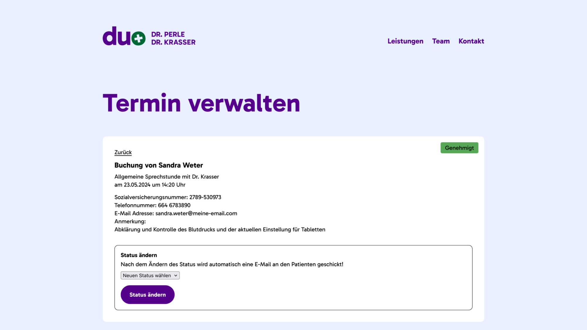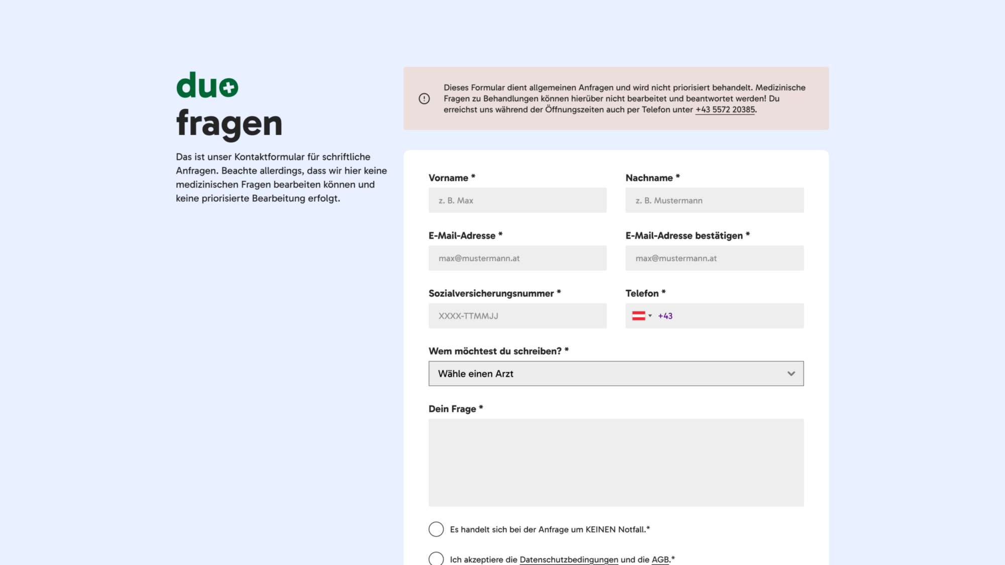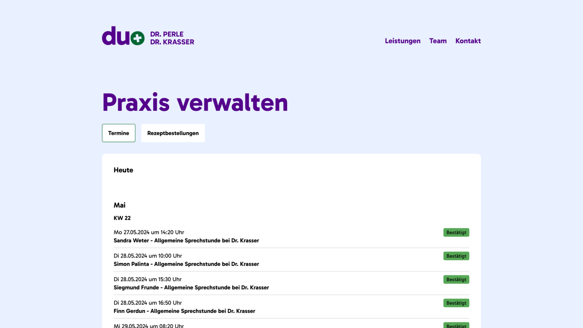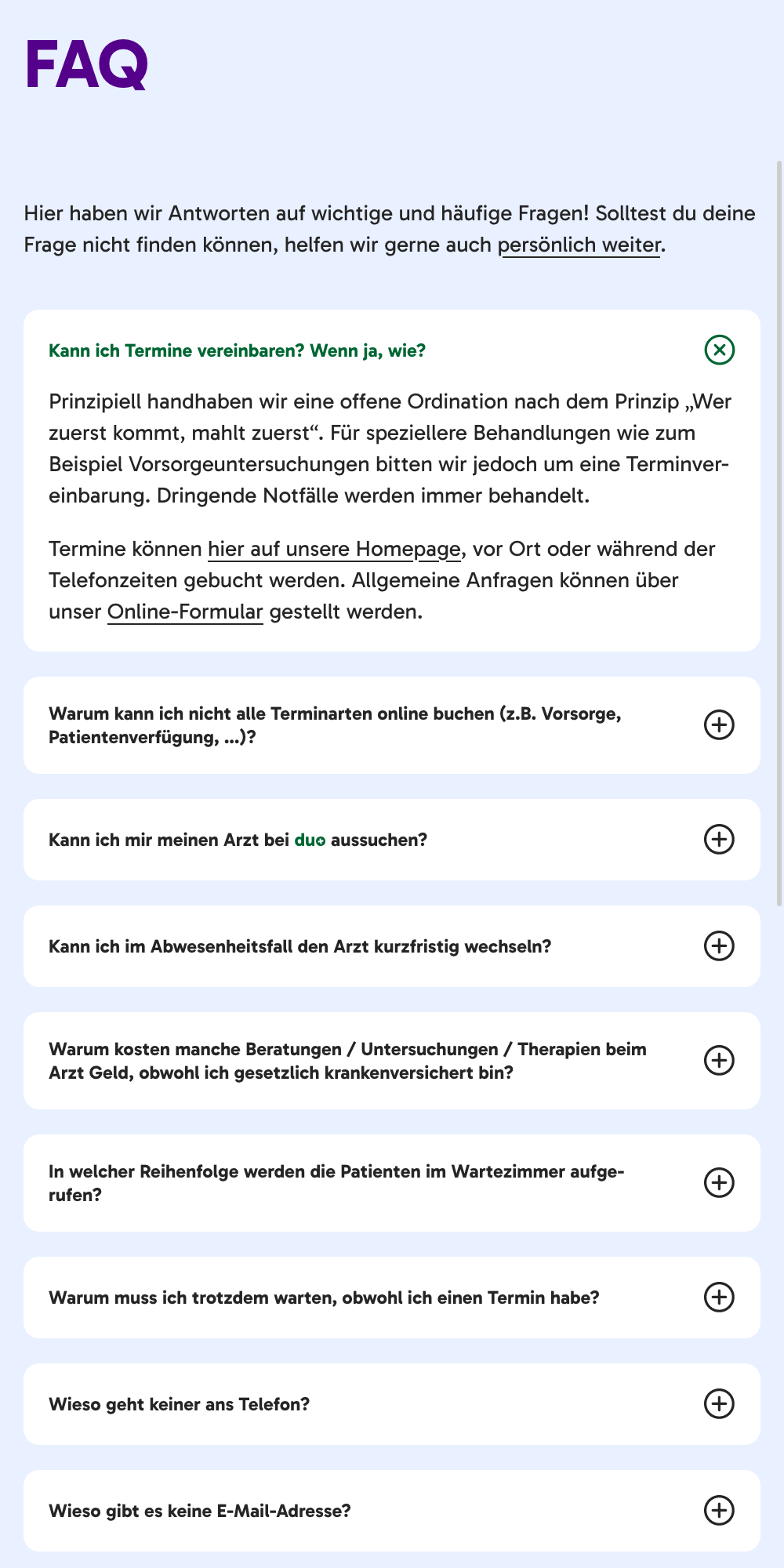 Für die duo Gemeinschaftspraxis war es wichtig, mit dem neuen Branding auch einen gemeinsamen, zeitgemäßen Online-Auftritt zu haben der den Patienten mehr bietet, als allein Öffnungszeiten und Kontakt. Die Website informiert über aktuell wichtige Infos, wie z.B. Impfungen und Vorsorgeuntersuchungen und zeigt ganz transparent die Preise für Privatleistungen. Für Patienten mit Dauermedikation besteht die Möglichkeit, die Rezepte online anzufordern – so sparen sie sich den Gang zur Arzpraxis.