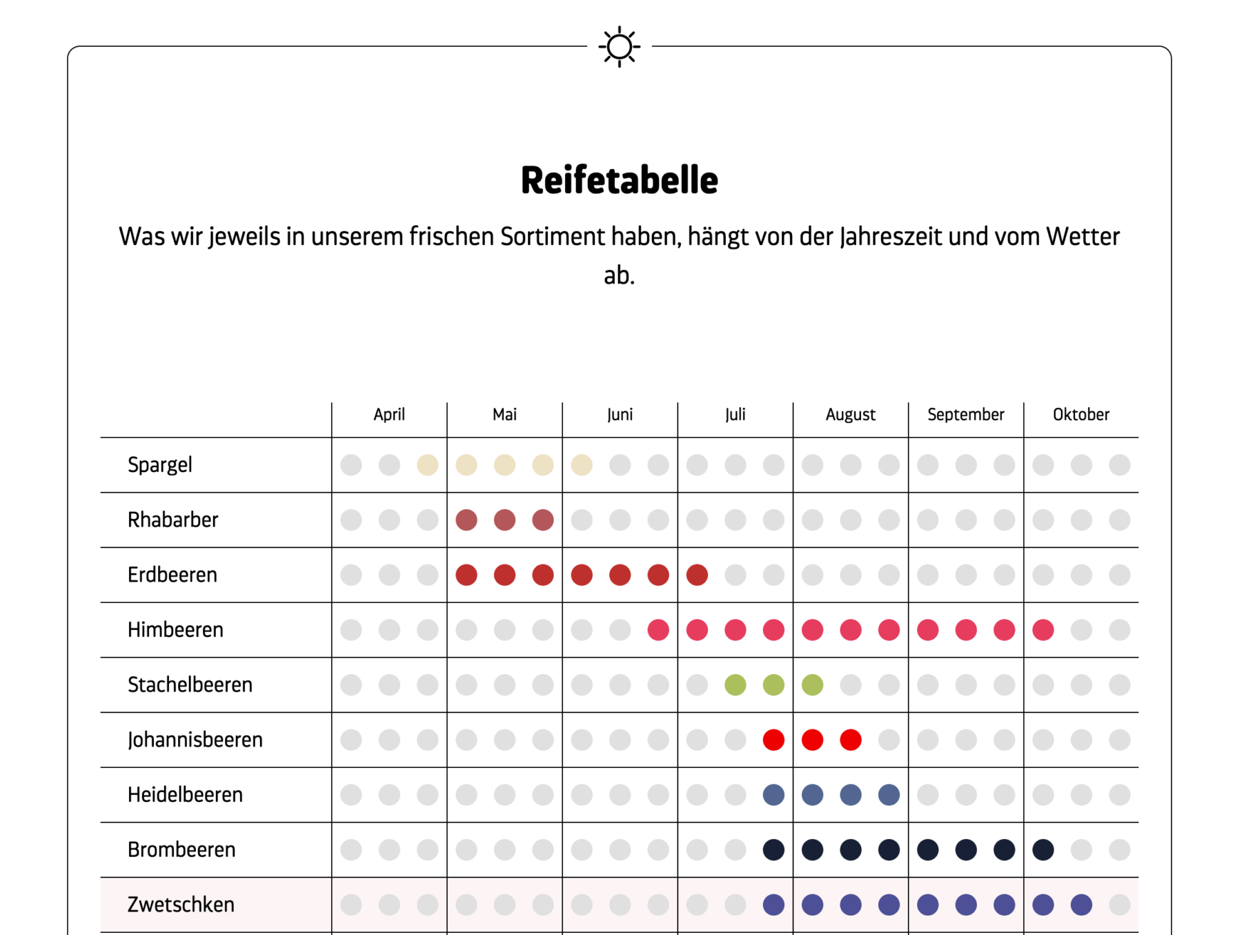 - Reifetabelle zur Darstellung der Verfügbarkeiten